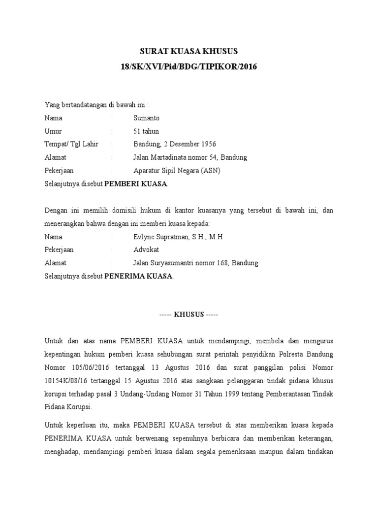 Contoh Surat Kuasa Khusus Pidana - Contoh Surat Kuasa Khusus - Yang bertanda tangan/bercap jempol tangan kiri di bawah ini:. Pada contoh gambar diatas, surat kuasa khusus pidana tersebut diberikan oleh terdakwa yudi setiawan kepada empat pengacara dari law. Contoh surat kuasa yang benar dan turorial lengkap cara membuatnya. Bertindak sebagai penasihat hukum pemberi kuasa selaku pelapor terhadap laporan pemberi kuasa terhadap tersangka iblis jahannam dalam perkara tindak pidana. Surat kuasa khusus yang benar. Kondisi yang tidak menentu terkadang membuat kita tidak sanggup menghadiri urusan penting.